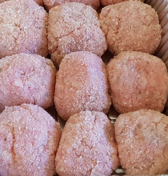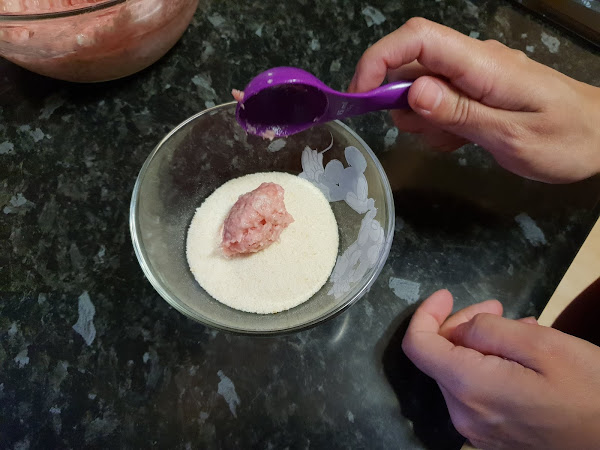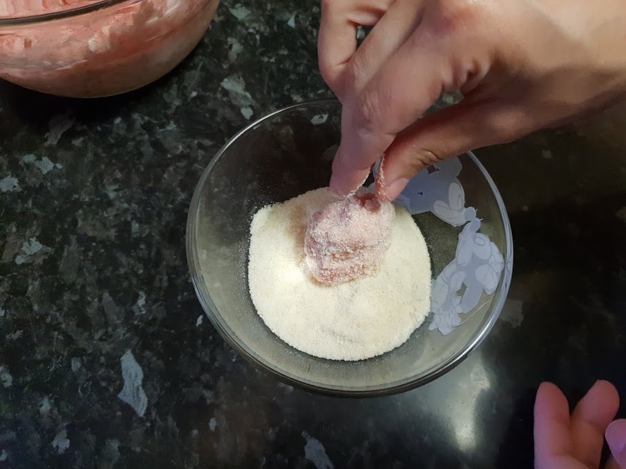 Vamos cogiendo mezcla, le damos forma redonda y las pasamos por el pan rallado.