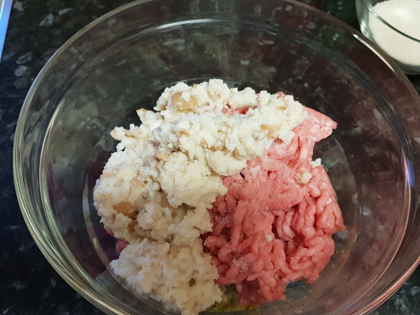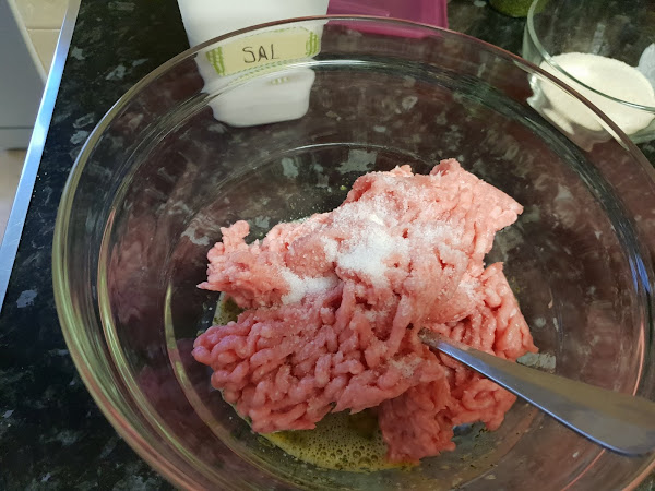 Le incorporamos la carne picada, la sal y la miga de pan que vamos a escurrir previamente.