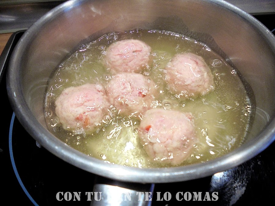 4. Freímos las albóndigas en abundante aceite de oliva. Si tienes freidora es mejor pero si no tienes como yo, lo mejor es un cazo hondo con bastante aceite. Es más lento pero así se hacen bien por dentro porque hay que tener en cuenta que no las vamos a guisar dentro de ninguna salsa.