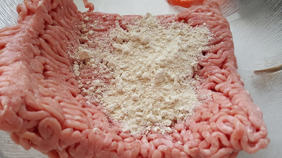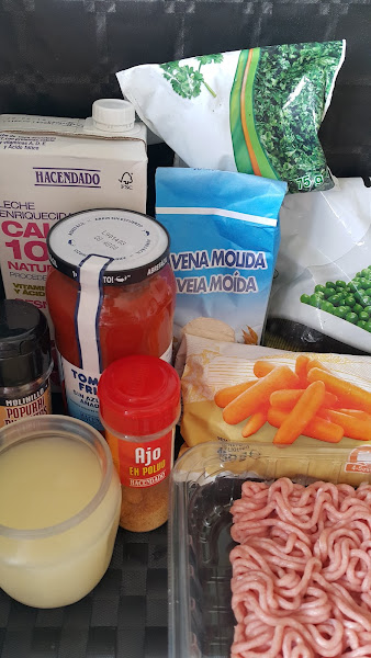 Empezaremos con la carne. En un bol amplio ponemos la carne picada, junto con 4 cucharadas soperas de leche y 6 de avena molida. Mezclamos todo bien hasta que se integren por completo.