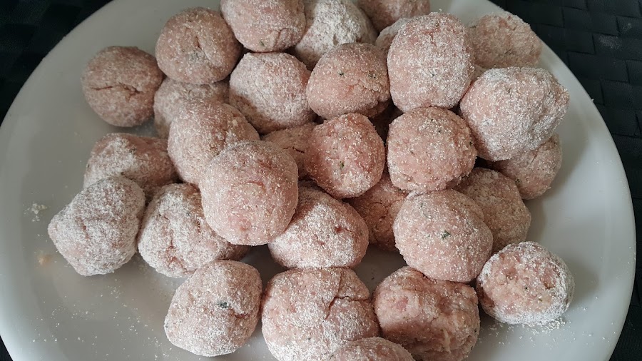 Hacemos las albóndigas y las pasamos por avena molida. Según el tamaño que hagáis os saldrán más o menos. A mí me salieron unas 40.