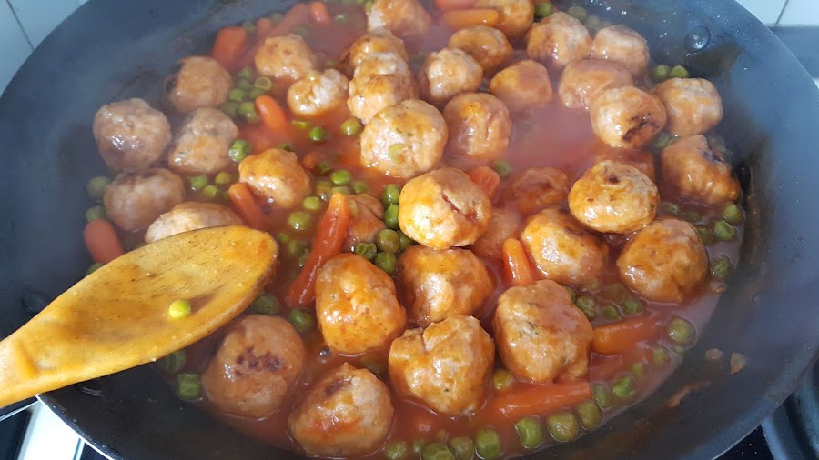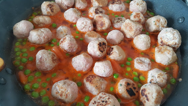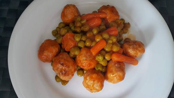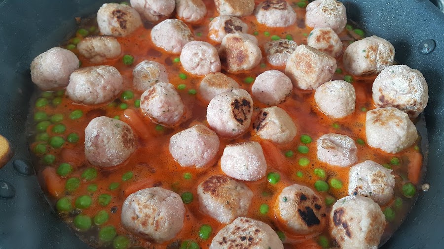 Y éste sería el resultado. Unas albóndigas a la jardinera pero bastante sanas y muy jugosas.