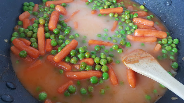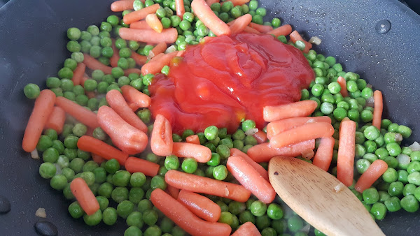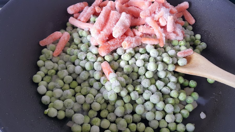 En la misma sartén añadimos los guisantes y la zanahoria. En mi caso usé producto congelado: unos 200gr de guisantes y unos 150gr de zanahoria.