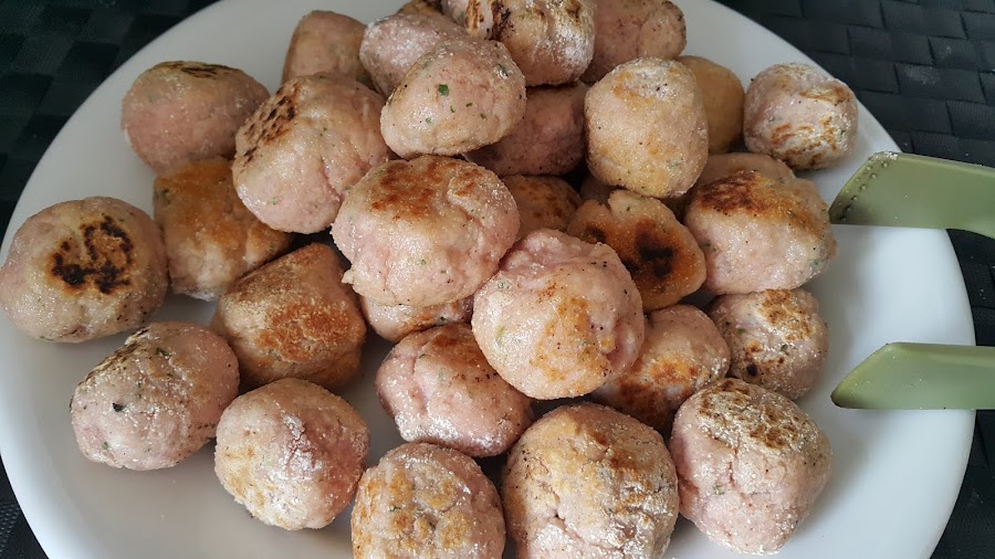 El aspecto de las albóndigas sería éste. Simplemente hemos tostado la parte exterior pero siguen crudas por dentro.