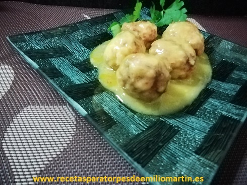 En la misma sartén donde hemos cocinado las cascaras(limpiándola de restos que hayan quedado), echamos un poco mas de aceite y rehogamos un poco de cebolla cortada en brunoise muy fina, cuando esté transparente, cocinamos un poco de harina, ponemos a fuego medio, añadimos las albóndigas de pescado y poco a poco parte del caldo, vamos moviendo la sartén o cazuela para que se vaya ligando la salsa, una vez ligada la salsa, retiramos y servimos.