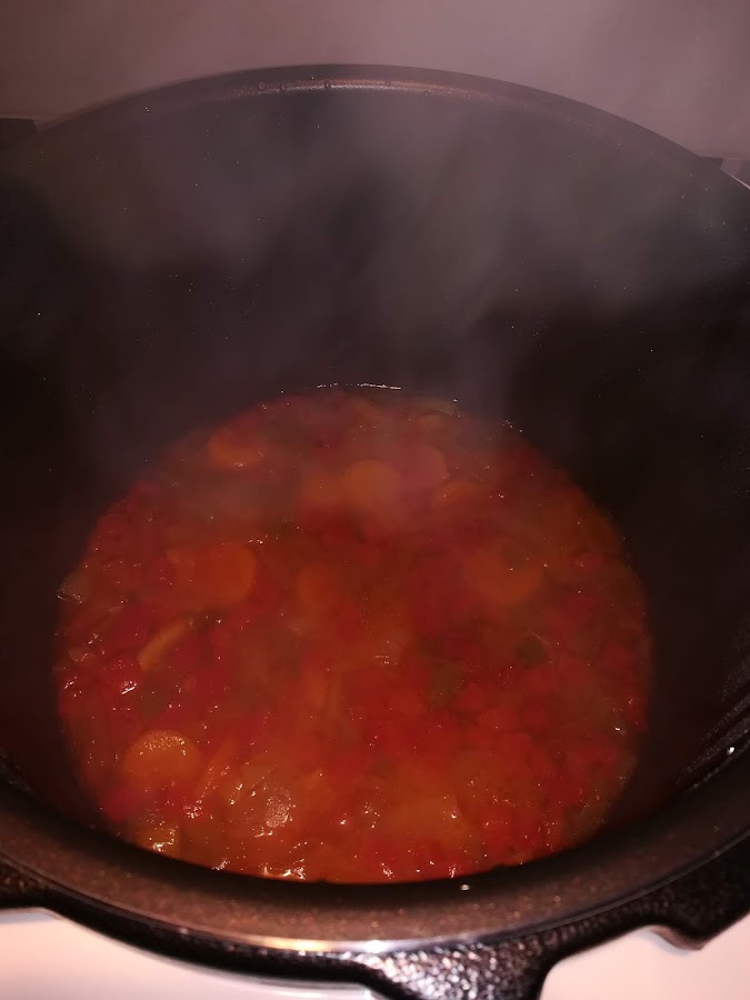 Ponemos en nuestra cubeta dos cucharadas de aceite en menú freír y echamos el pimiento rojo y verde, puerro, cebolla, zanahoria, ajo y dos cucharadas de tomate o un tomate natural. Rehogamos un poco y ponemos Menú VERDURA 5 MIN, Textura media. Cancelar, despresurizar y ponemos la medida de vino blanco y dos medidas de agua y ponemos 2 Min. Menú VERDURA. Cancelar y despresurizar.