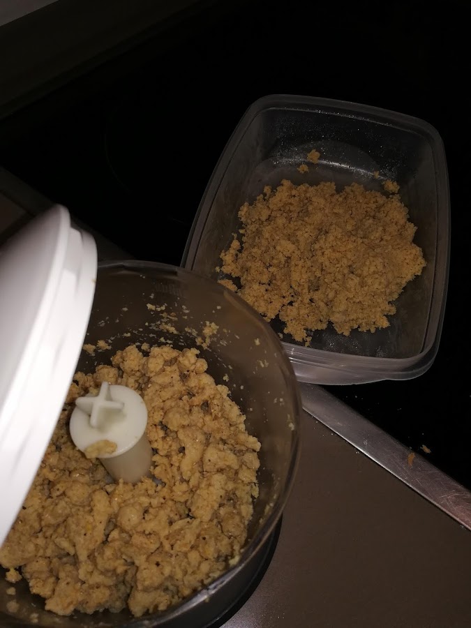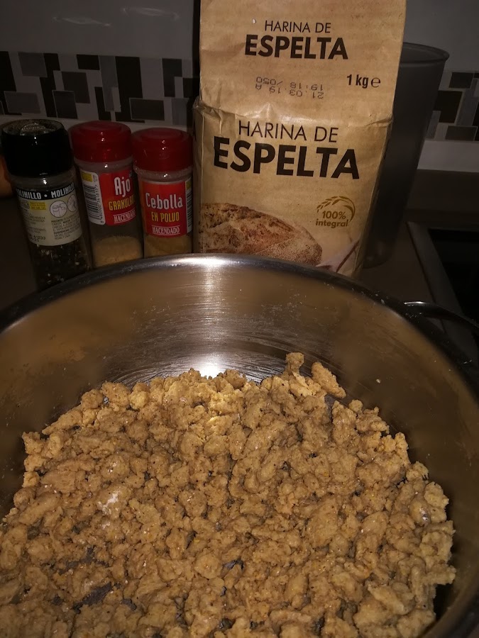 En un bol ponemos la soja texturizada escurrida, la harina, el ajo, la cebolla, la pimienta, la sal y el perejil y lo mezclamos bien. En el vaso de la batidora ponemos la mezcla (yo puse mitad y luego la otra mitad) Tritura unos segundos hasta conseguir una masa homogénea y que todos los ingredientes estén integrados.