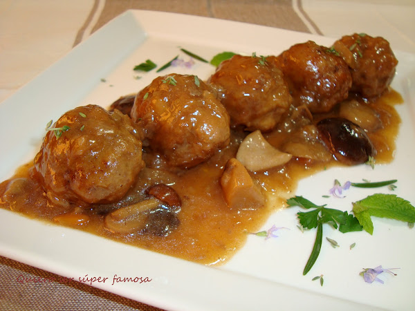 A continuación ya podéis echar el caldo caliente y el concentrado de carne. Dar un hervor y añadir las albóndigas. Cocinar por espacio de unos 15 minutos a fuego lento. O hasta que veáis la salsa a vuestro gusto. Espesa un poquito más al atemperarse.