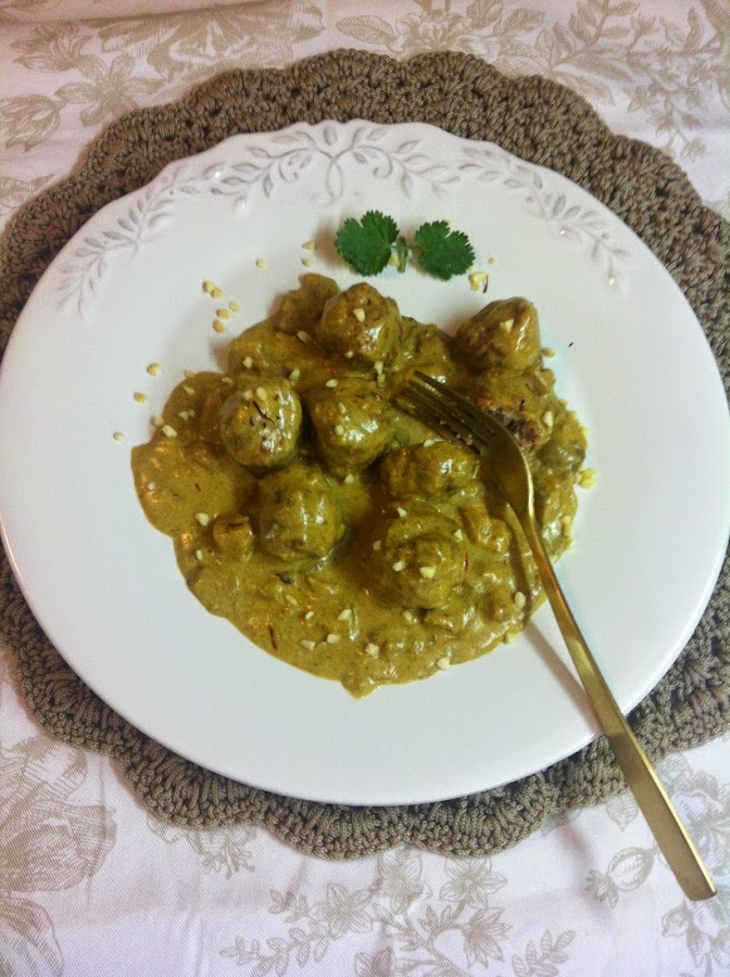 Se añade la nata (crema de leche) líquida y el azafrán, se deja que dé un hervor y se vierte sobre las albóndigas en la cazuela. Se incorpora otra cucharada de almendras molidas y se deja que hierva, a fuego lento, unos 15 minutos. Se remueve de vez en cuando.