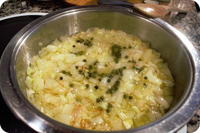 Cuando el sofrito adquiera color, añade la pimienta verde. espera un poco, da unas vueltas.