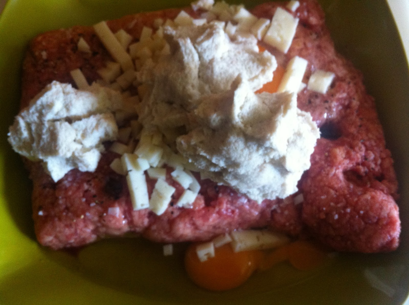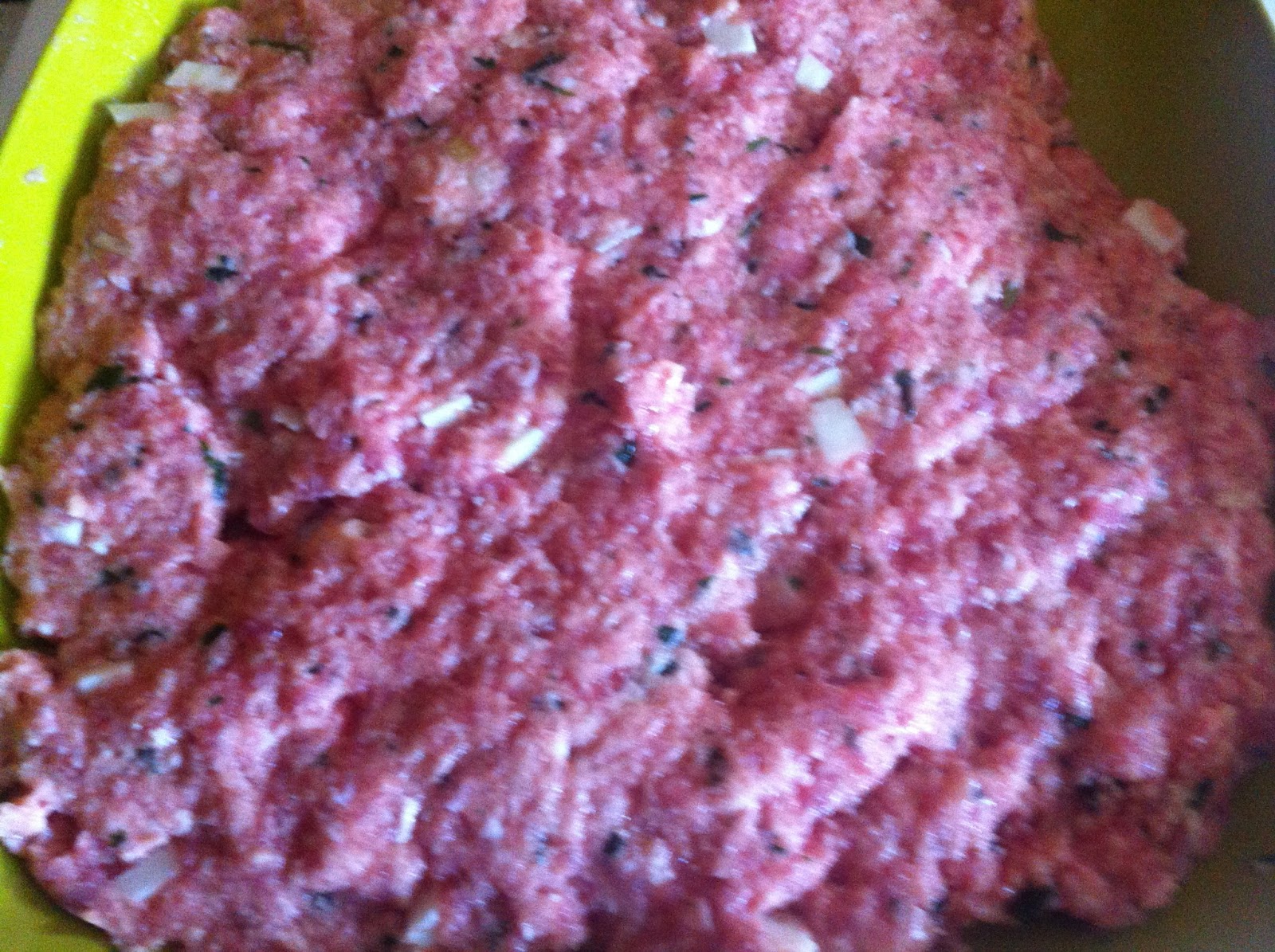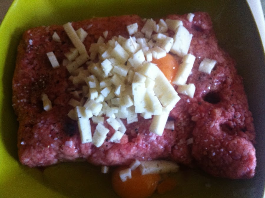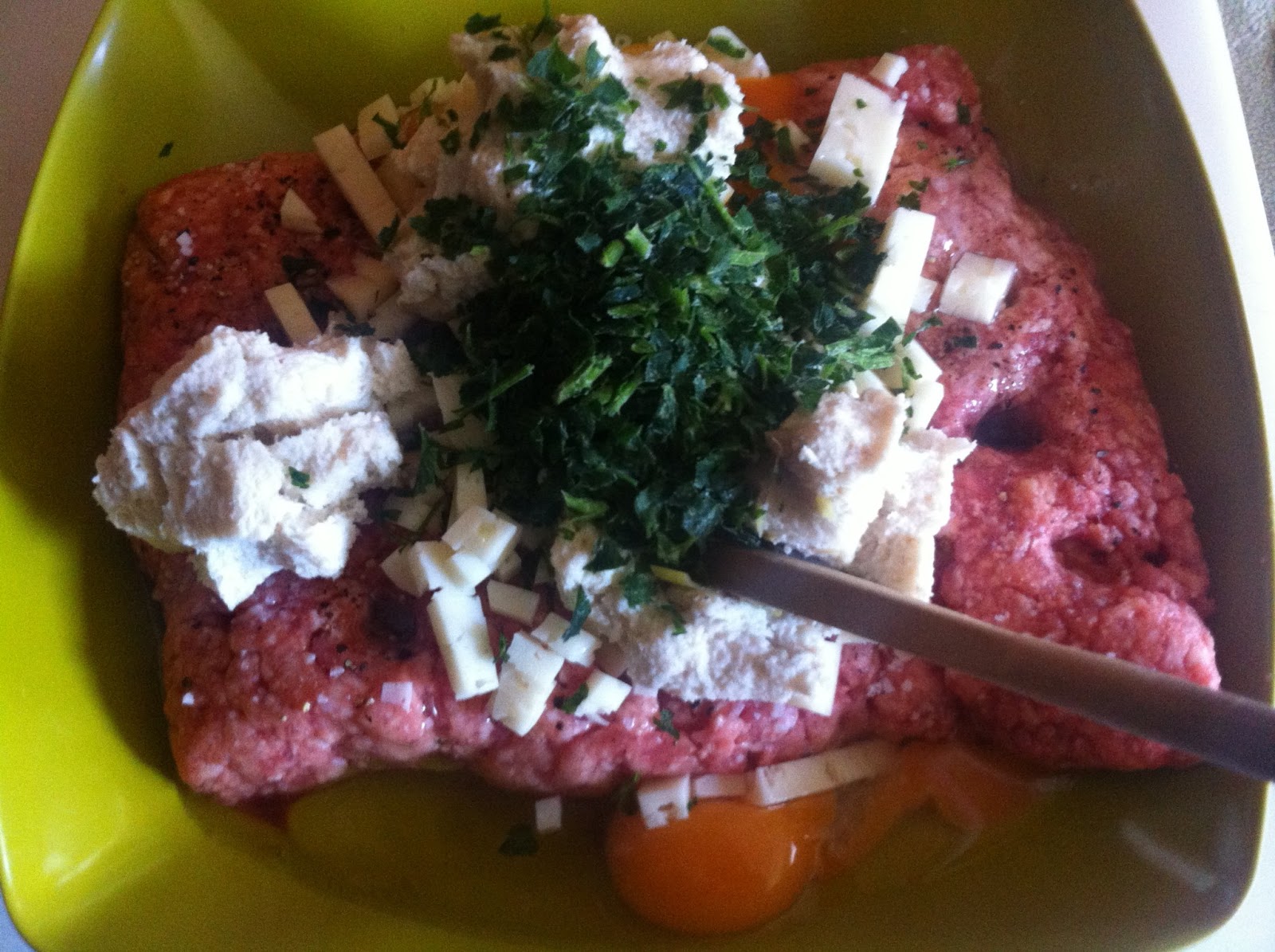 En un bol grande poner la carne picada, echar los dos huevos (yo no los bato), el queso cortado en cuadraditos, un puñado de perejil picado, sal, pimienta y el pan escurrido (escurrirlo estrujándolo con la mano para quitar el exceso de leche) y con las manos bien limpias mezclar todo bien y dejar reposar 1/2 horita aproximadamente.