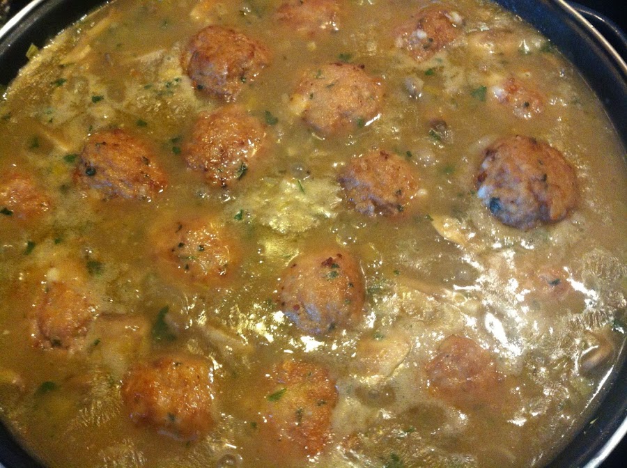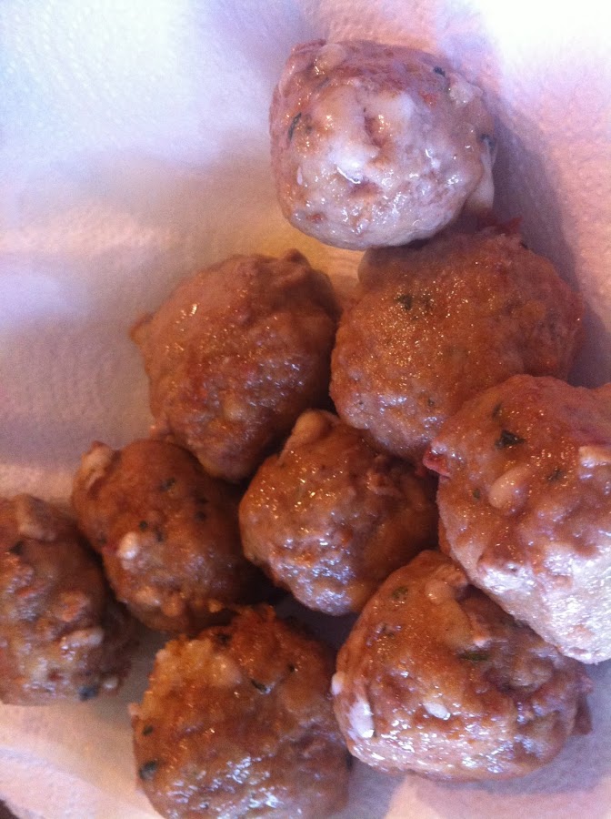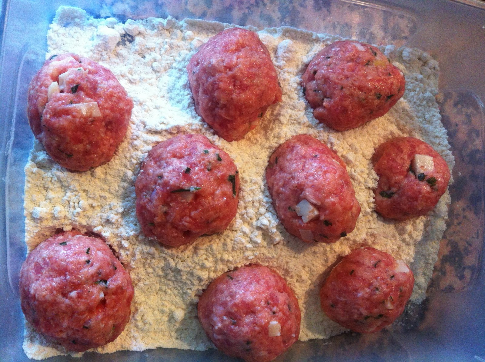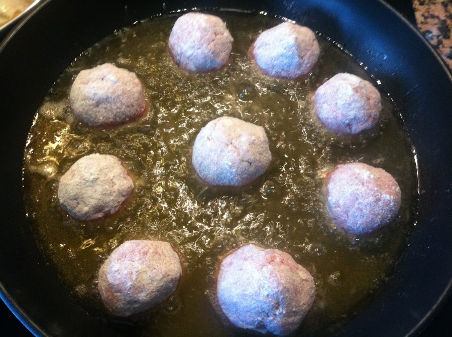 Mientras se van haciendo los champis, hacer "bolas " del tamaño deseado, pasar por harina (sacudir el exceso de harina) y freírlas en una sartén con abundante aceite para "sellarlas" por fuera, ya que se terminarán de hacer en la salsa.