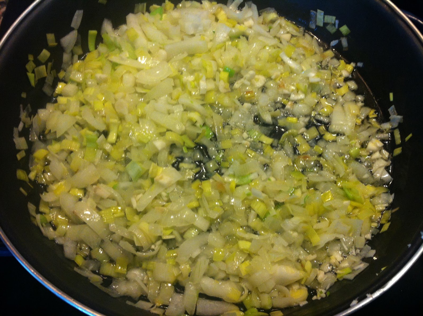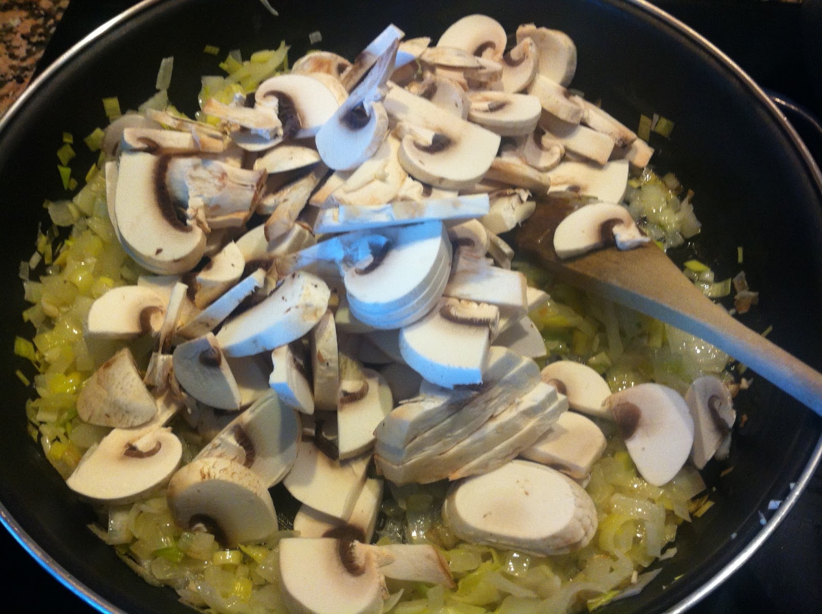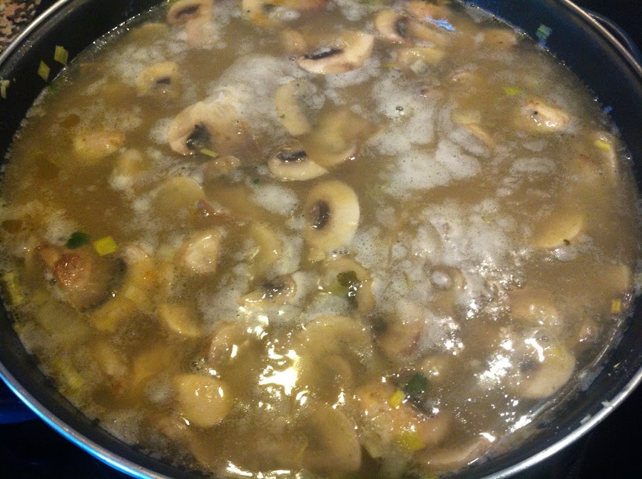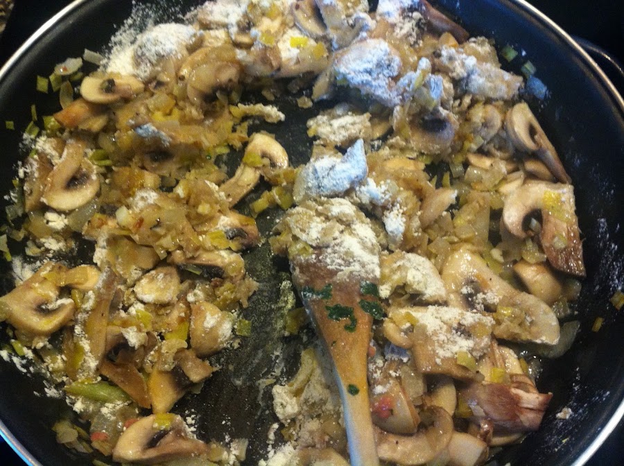 En la cazuela donde tenemos la cebolla, el ajo y los champis, como ya estarán hechos...echar dos cucharadas de harina y remover hasta que veáis que no queda nada de harina, entonces echar el chorrito de brandy, 2 vasos de agua y la pastilla de caldo concentrado y remover.