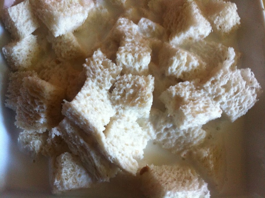 En un bol pequeño poner el pan del día anterior o las rebanas de pan de molde cortado en cuadraditos (quitarle la corteza) y cubrir de leche para que se empape bien.