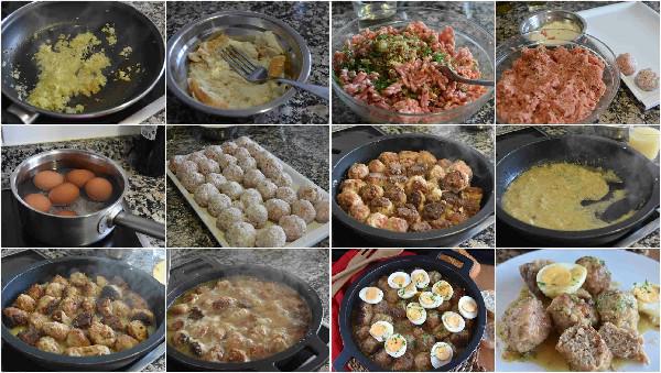 Elaboración de las albóndigas en salsa con huevos cocidos: