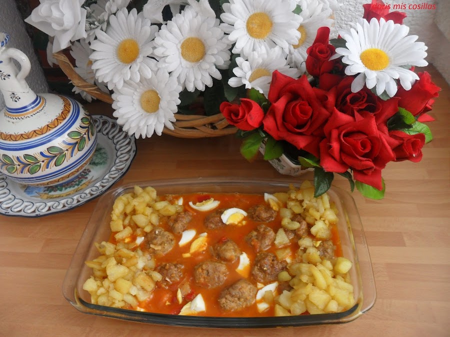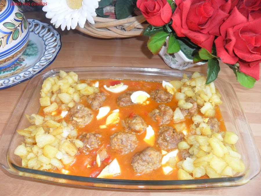 Pasamos por un pasa-puré la salsa y ponemos en una cazuela al fuego nuevamente, le volcamos las albóndigas reservadas, tapamos y dejamos cocer hasta que estén tiernas a nuestro gusto.( Si hiciera falta le agregamos un poco mas de agua caliente) Emplatamos acompañándolas del huevo cocido picado a grosomodo y las patatas fritas reservadas y listas para el almuerzo.