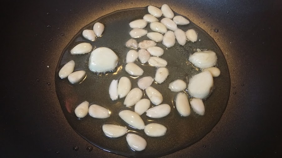 Unas vez preparadas y fritas las albóndigas, en una sartén amplia freír los ajos pelados pero enteros y las almendras. Cuidado que no se quemen, solo hay que dorarlos.
