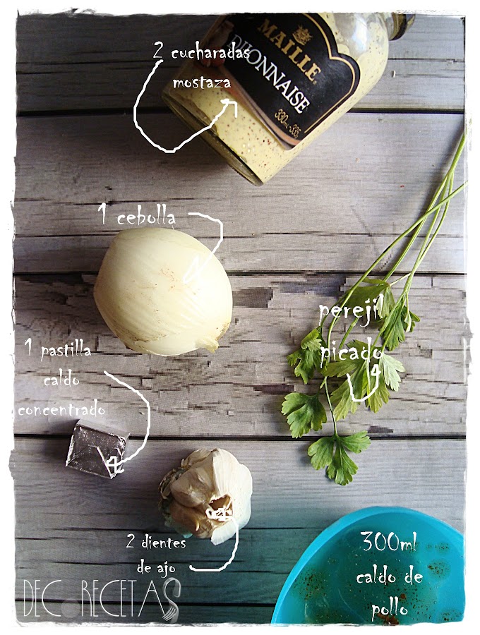 Doramos la cebolla y el ajo. Añadimos el caldo de pollo y mostaza junto con una pastilla de caldo concentrado. Dejamos reducir unos minutos a fuego bajo