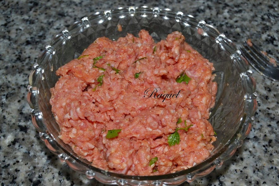 Ponemos en un bol grande el huevo batido con la sal, la cúrcuma, el ajo y el perejil cortado a trocitos pequeños, mezclamos y echamos la carne picada, mezclamos bien.