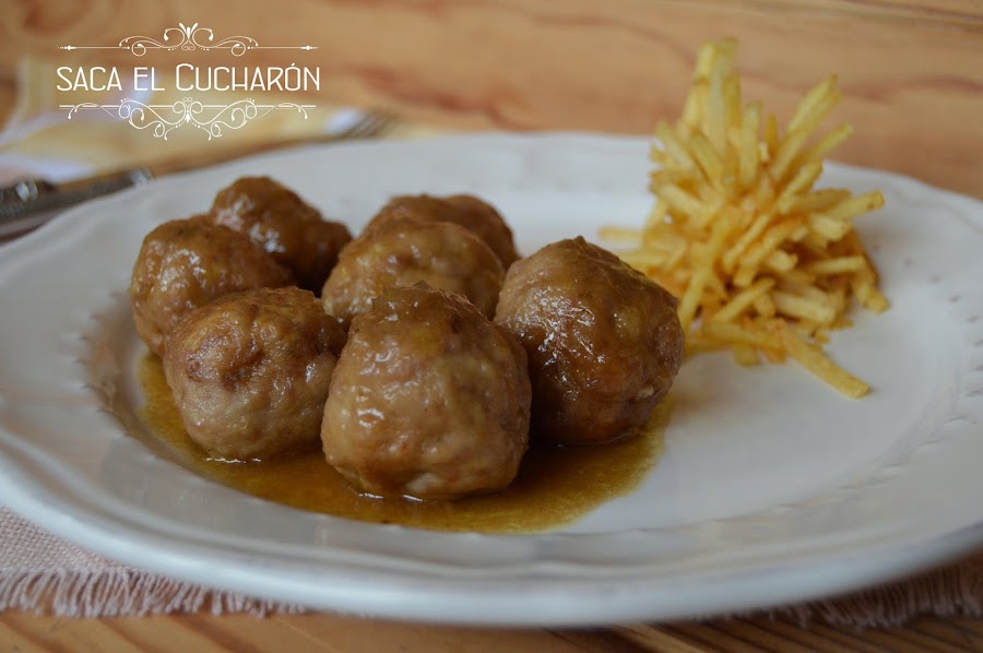 Servimos nuestras albóndigas bien calentitas con salsa por encima. El mejor acompañamiento para este plato son unas buenas patatas fritas.