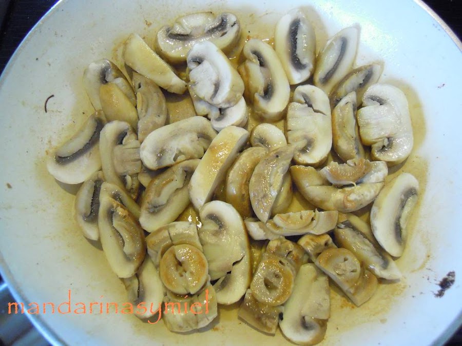 Los champiñones no los corta en trocitos, utiliza solo las cabezas.....pero como no me cabía nada más en la cazuela decidí cortarlos en trocitos.