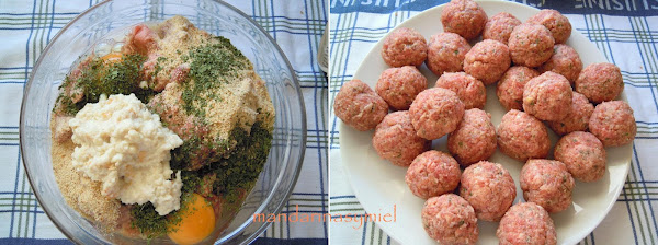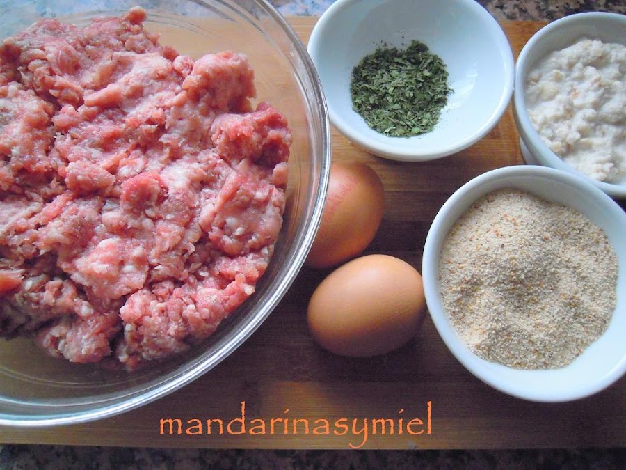 La receta original no es exactamente como yo la he hecho, Martín no hace albóndigas, hace como unas mini hamburguesas y luego las asa en la sartén antes de ponerlas en la salsa.