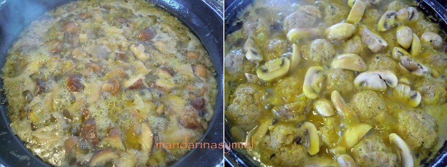 Echa los champiñones salteados a la cazuela y añade las albóndigas, deja que se hagan a fuego lento unos 10 minutos. Apaga el fuego y deja que reposen unos minutos.