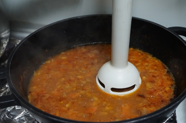 Añadimos el vino blanco, dejamos evapore el alcohol y ponemos un vaso de agua. Ahora sería el momento de poner las albóndigas, pero si os gusta la salsa sin tropezones yo lo trituro en este momento.