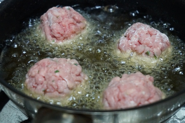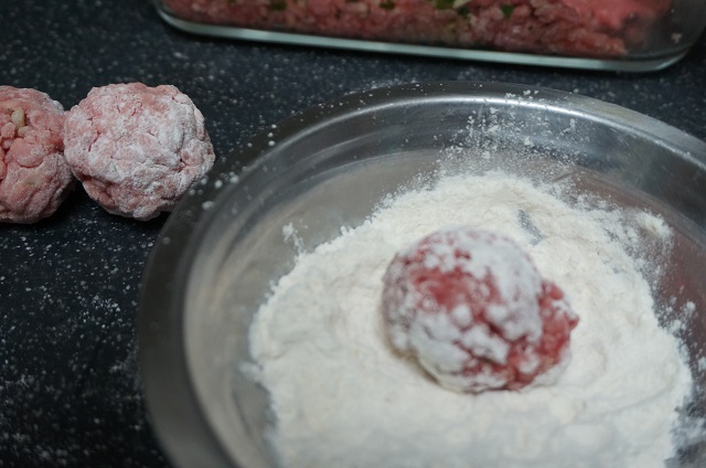 Pasado este tiempo preparamos las albóndigas. Ponemos harina en un bol e iremos haciendo las bolas de albóndigas las pasaremos por la harina. Por otro lado ponemos una sartén con aceite a fuego un poco fuerte, cuando estén caliente iremos friendo las albóndigas, solo hay que dorarlas por fuera. Las iremos sacando y reservaremos.