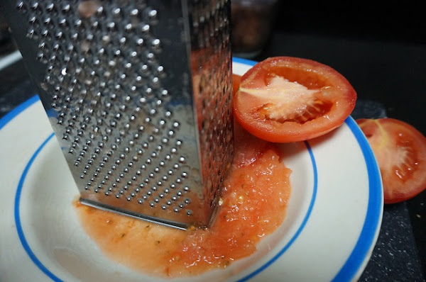 Rallamos los tomates y picamos la cebolla y el ajo.