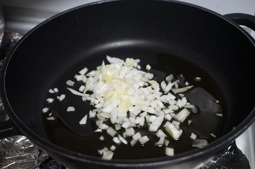 Ponemos una cazuela al fuego, añadimos un poco de aceite y ponemos la cebolla y el ajo picado. Dejaremos a fuego medio que se cocine un poco. Unos 3-4 minutos.