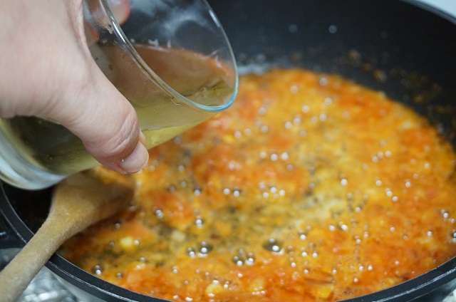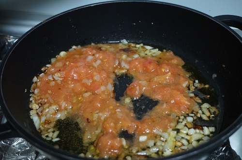 Cuando empiece a tomar color añadimos el tomate, removemos y ponemos el tomate frito. Lo dejamos cocinar unos minutos.