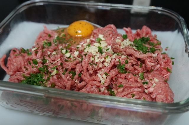 Empezaremos preparando la carne. Pondremos en un bol la carne picada, añadimos el ajo picado, el perejil y el huevo. Lo mezclaremos todo bien, tapamos y lo dejaremos unas horas en la nevera para que cojan los sabores. Podéis preparar esto la noche anterior.