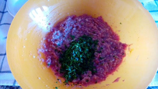 En un cuenco poner la carne, el pan, el huevo, perejil finamente picado, aliños y juntar bien hasta formar una masa. Si ves que está muy líquido puedes agregar pan rallado. La idea es que te quede una consistencia adecuada para hacer bolitas.