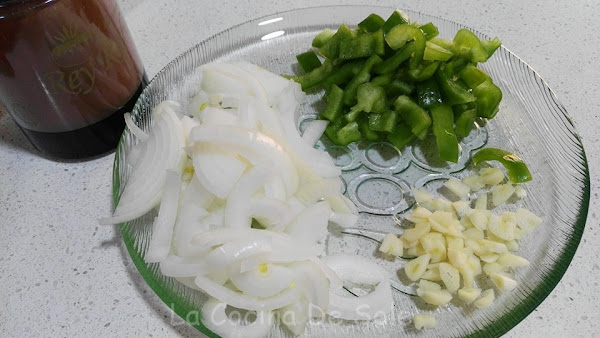 Ahora, preparamos la salsa de tomate, empezando a trocear el pimiento, la cebolla la cortamos a juliana y el ajo a lasquitas.
