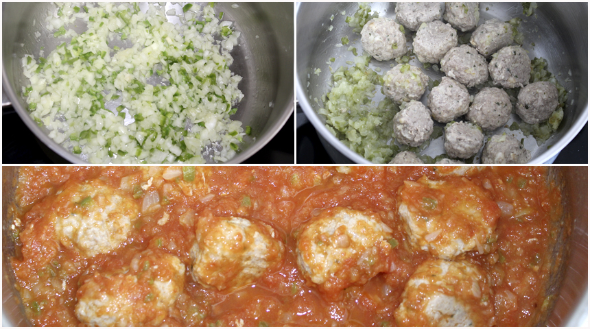4.-Una vez hechas las verduras, incorporamos las albóndigas, el tomate, un chorrito de agua y guisamos unos quince minutos a fuego medio. Rectificamos el punto de sal. Podemos acompañarlas de arroz cocido o patatas fritas. Yo me decanto por las patatas fritas.