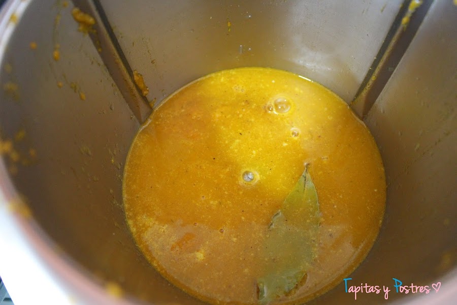 Al acabar, sacamos el cestillo, trituramos la salsa y agregamos agua, laurel, pastilla de caldo, pimienta y nuez moscada.