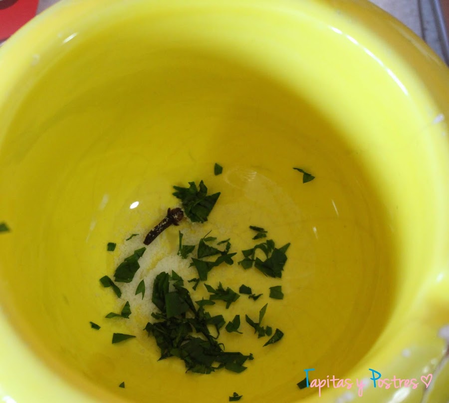 Mientras se cocina ponemos el perejil, el clavo y la sal en un mortero y machacamos hasta hacer una pasta.