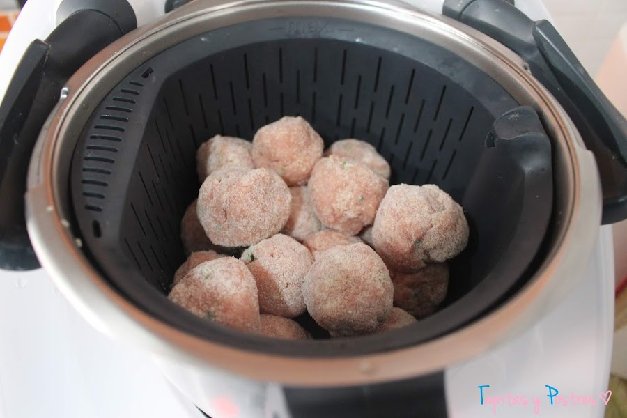 Añadimos esta pasta al vaso junto al vino y al tomate frito. Ponemos las albóndigas en el cestillo y lo metemos en el vaso. Cocinamos 3 minutos, temperatura Varoma y velocidad 1.