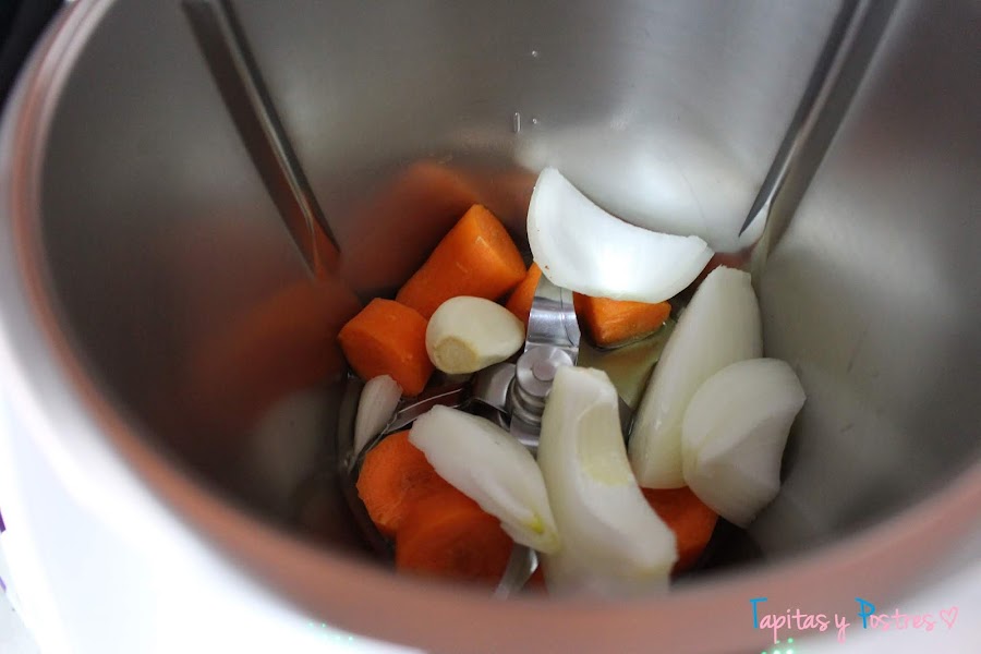 Cortamos y pelamos la cebolla y la zanahoria en trozos. Las ponemos en el vaso de la thermomix con el ajo y el aceite. Trituramos 5 segundos a velocidad 5. A continuación programamos 10 minutos, varoma y velocidad 1.