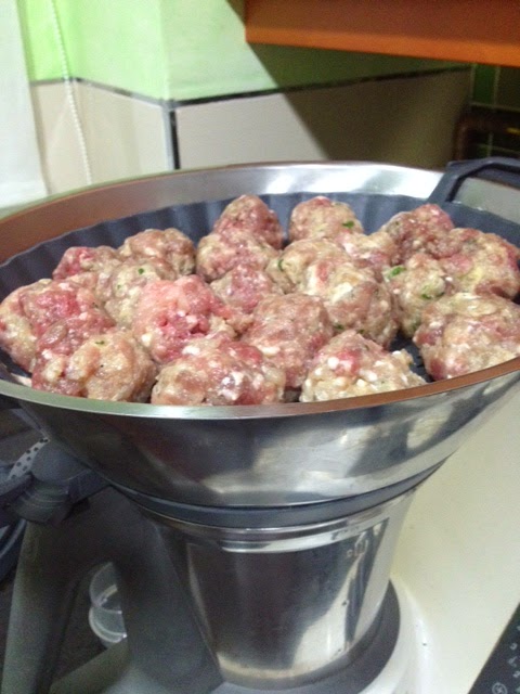a) Con las manos engrasadas en aceite, hacemos las albóndigas y las colocamos en el recipiente varoma de la thermomix