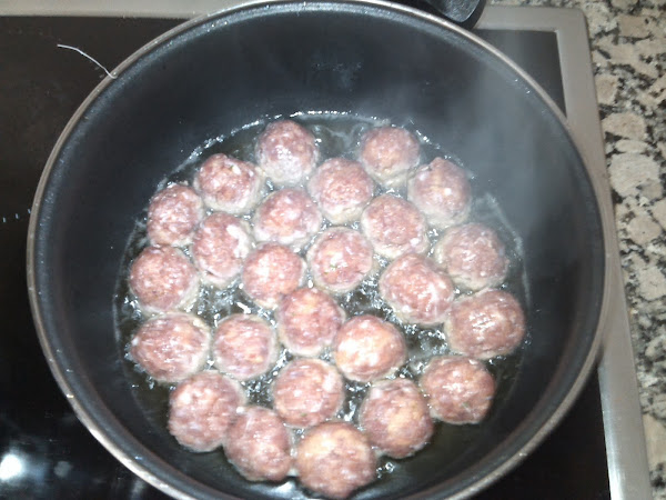 3.En la misma cacerola que vamos ha hacer las albóndigas ponemos aceite a fuego medio y freímos las albóndigas.Una vez que empiezan a dorarse las retiramos.