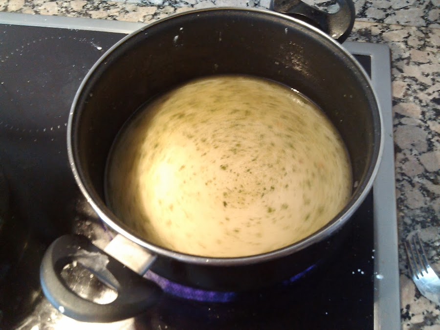 5.Incorporamos una cucharada de maizena o harina y damos unas vueltas.A continuación añadimos el agua previamente calentada en el microondas y a fuego medio cocinamos la salsa hasta que levante el hervor.