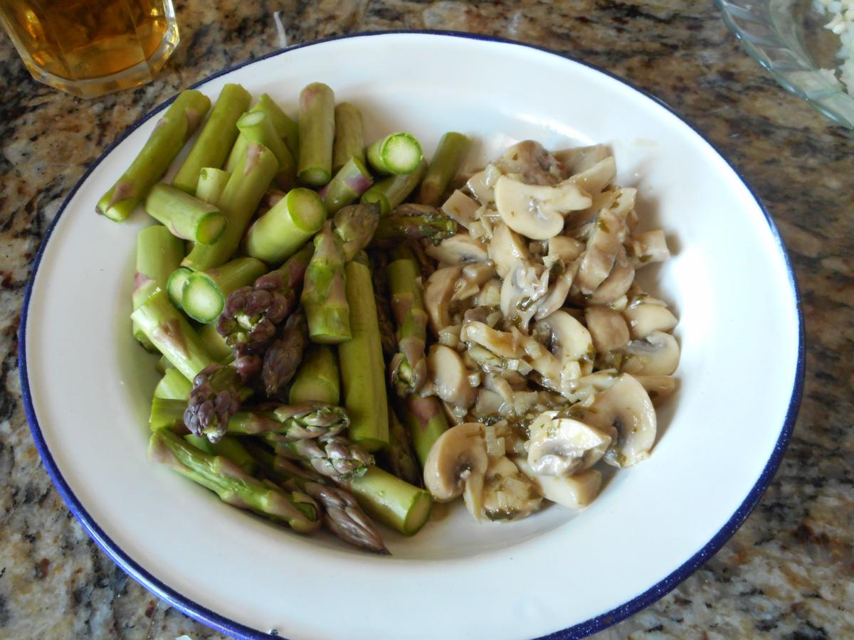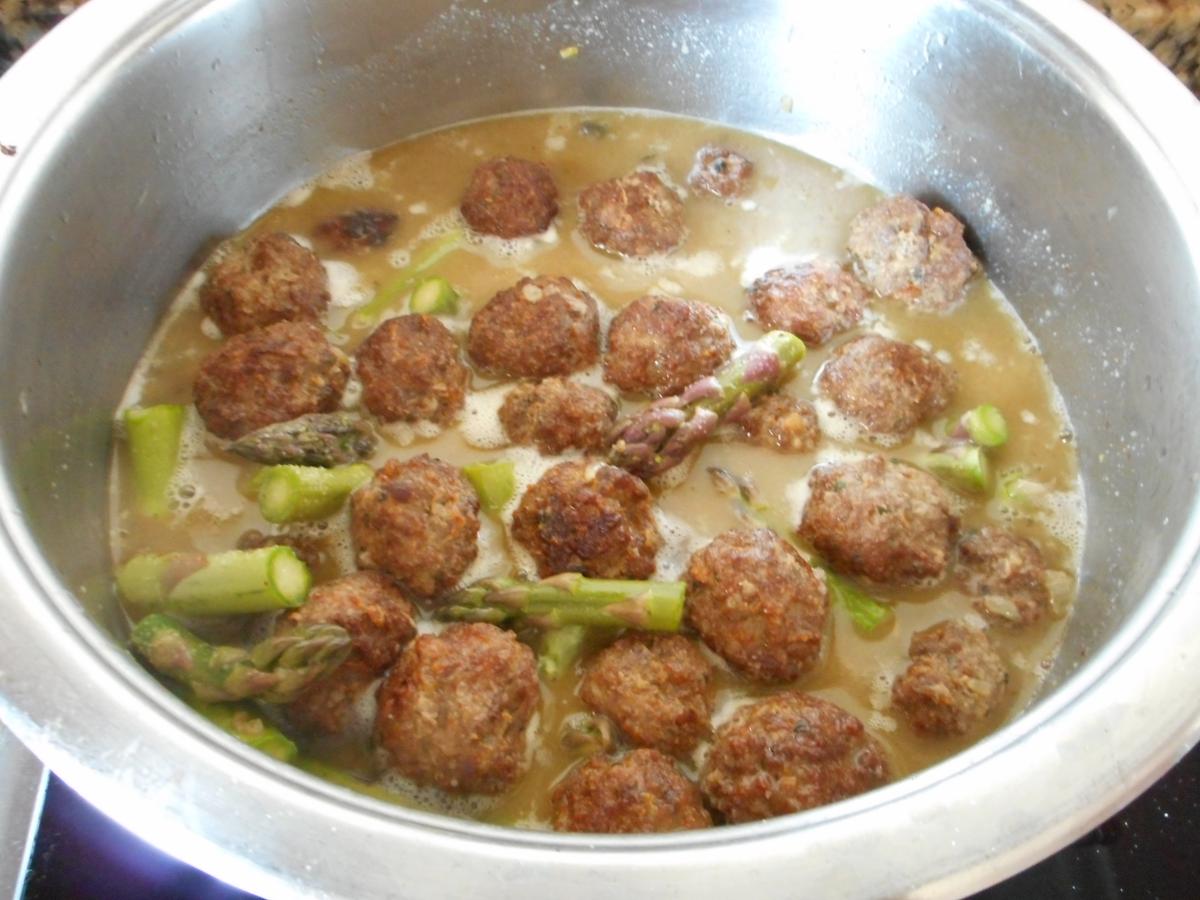 Echar el agua, las albóndigas, los espárragos cortados a trozos y los champiñones.