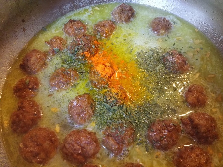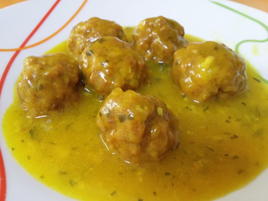 Echamos las albóndigas, el perejil, sal al gusto y el azafrán o cúrcuma, o ambas cosas.