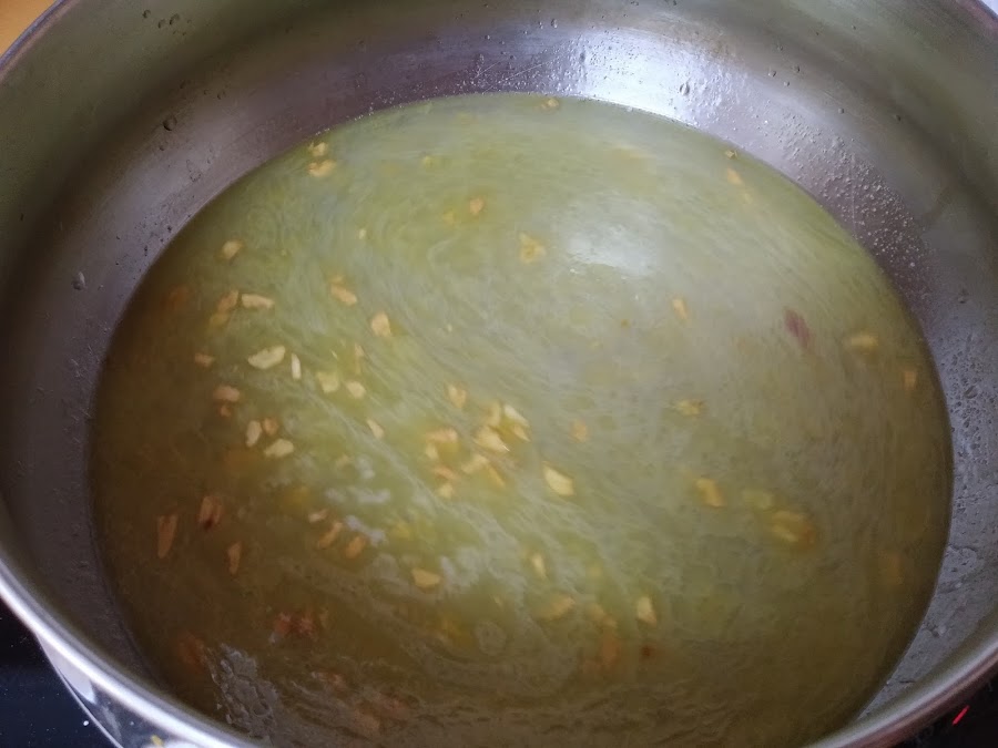 En un cacerola amplia, ponemos un poco de aceite y sofreímos los ajos picados.