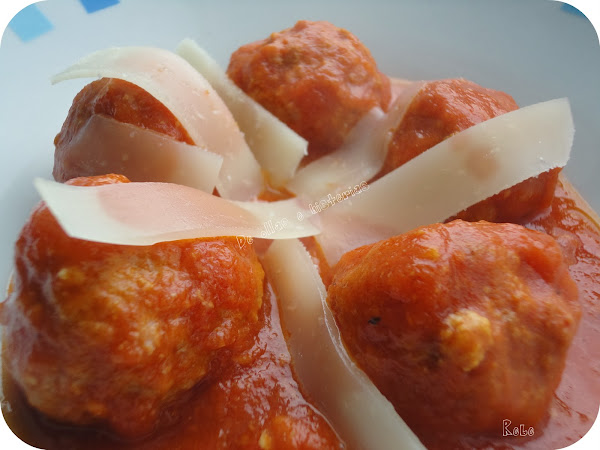 Servimos las albóndigas en caliente con una buena cucharada de salsa y unas láminas de queso curado..a disfrutar