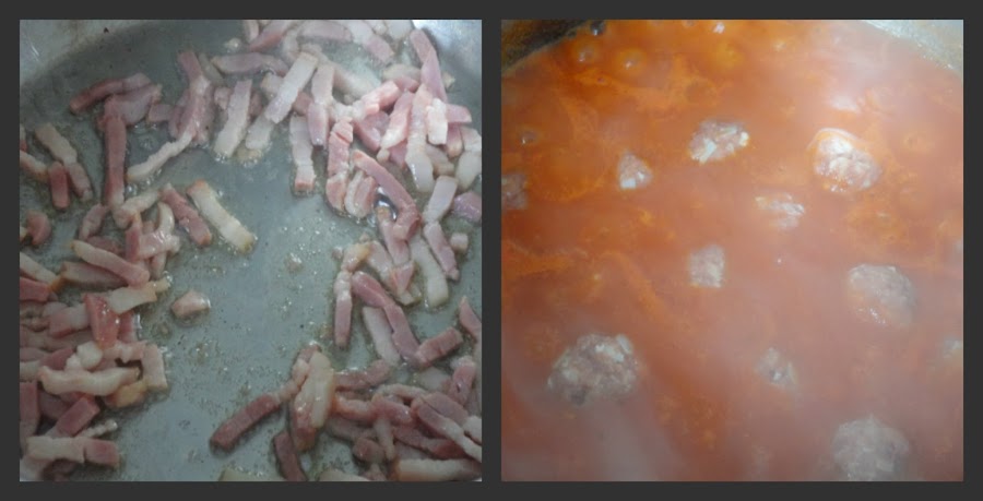 Agregamos la salsa de tomate, mezclamos bien con el bacon y, dejamos que llegue a ebullición la salsa.