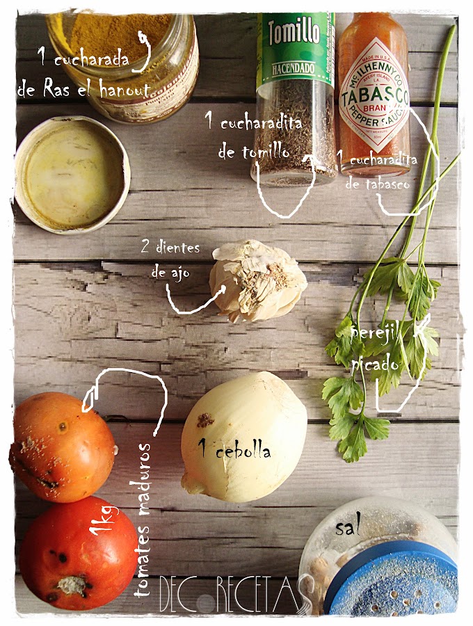 Para la salsa escaldamos los tomates en agua caliente y les quitamos la piel. En una cazuela doramos el ajo junto con la cebolla y añadimos los tomates picados, el tomillo, perejil ,Ras el Hanout, sal y pimienta