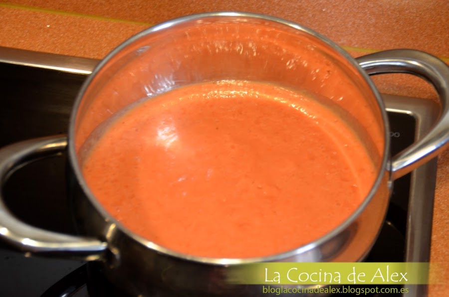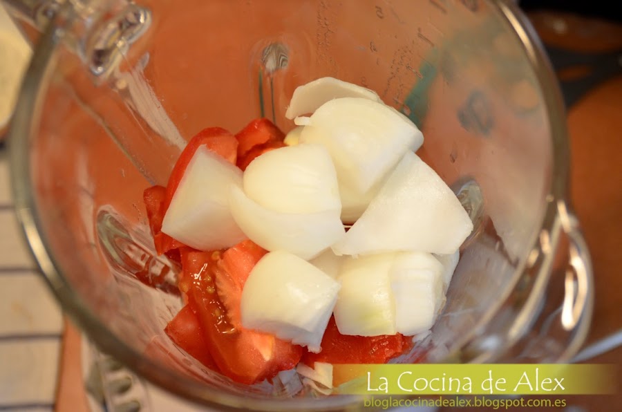 Troceamos el tomate quitándole los tallos poniéndolos en un vaso batidor, agregamos la cebolla troceada, los dientes de ajos pelados y la sal. Trituramos todo hasta obtener una mezcla fina y sofreímos en una cazuela a fuego lento con un chorreón de aceite de oliva virgen extra durante 15-20 min o mientras terminamos el plato.